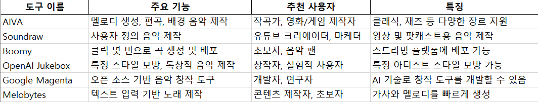 AIVA, Soundraw, Boomy, OpenAI Jukebox 등 다양한 도구들이 각기 다른 강점을 가지고 있어,